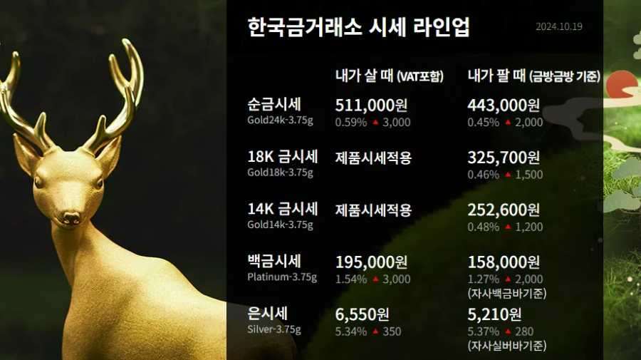 10์ 19์ผ ๊ธ์์ธ๋ ํ๊ตญ ๊ธ๊ฑฐ๋์์์์ ๊ธ์์ธ ๋ท์ปด์ ์กฐ๊ธ ์ฐจ์ด๊ฐ ์์ต๋๋ค. ํ๊ตญ๊ธ๊ฑฐ๋์์์๋ ๊ธ 1๋ ์์ธ๊ฐ ์ด ๋ 511,000์ ํ ๋ 443,000์์ ๋๋ค. ๊ธ์์ธ ๋ท์ปด์ ๊ฒฝ์ฐ ์ด ๋ 503,000์ ํ ๋ 447,000 ์์ ๋๋ค. ๊ธ์์ธ๋ ๋งค์ผ ๋ณ๋์ด ์์ผ๋ ์์ฃผ ํ์ธํ๋ ๊ฒ์ด ์ข์ต๋๋ค.