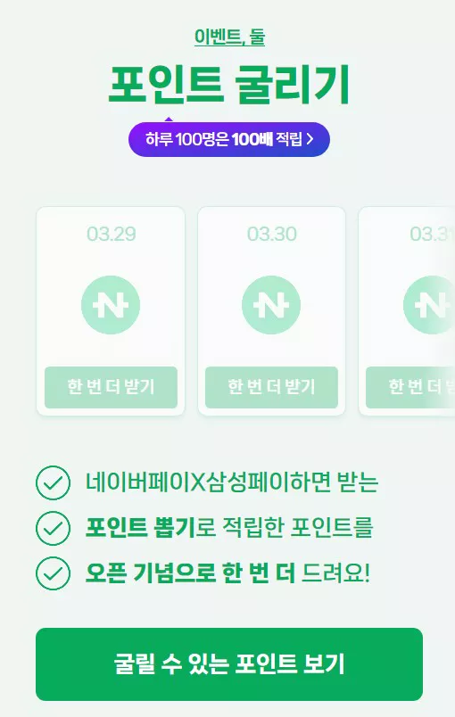 3์ 29์ผ๋ถํฐ 4์ 30์ผ๊น์ง ๋ค์ด๋ฒํ์ด ์ผ์ฑํ์ด๋ก ์ฒซ ํ์ฅ ๊ฒฐ์ ์์๋ ๋ฐ๋ก 2์ฒ ํฌ์ธํธ๋ฅผ ์ ๋ฆฝ๋ฐ์ ์ ์์ต๋๋ค.