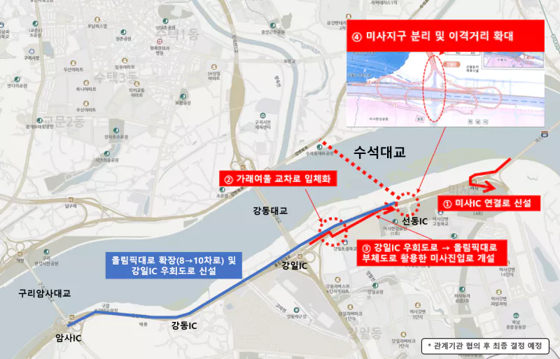 ๊ทธ ์ธ์๋ ๊ฐ์ผ์ง๊ตฌ์ ์์ธ ์กํ๊ตฌ๋ฅผ ์ฐ๊ฒฐํ๋ ์ฃผ์ ๋๋ก๋ค์ด ๋น ๋ฅด๊ฒ ๊ฐํต๋ ๊ณํ์ด๋ฉฐ, ํนํ ์๋๊ถ ์ 1์ํ ๊ณ ์๋๋ก์ ๊ตํต๋์ ๋ถ์ฐ์ํค๊ธฐ ์ํด ์ํ๋จ IC์์ ์ด๊ด์ผ๊ฑฐ๋ฆฌ๊น์ง์ ๊ตฌ๊ฐ ํ์ฅ ๊ณต์ฌ๊ฐ ๋ด๋ ๊น์ง ์๋ฃ๋ ์์ ์ ๋๋ค.