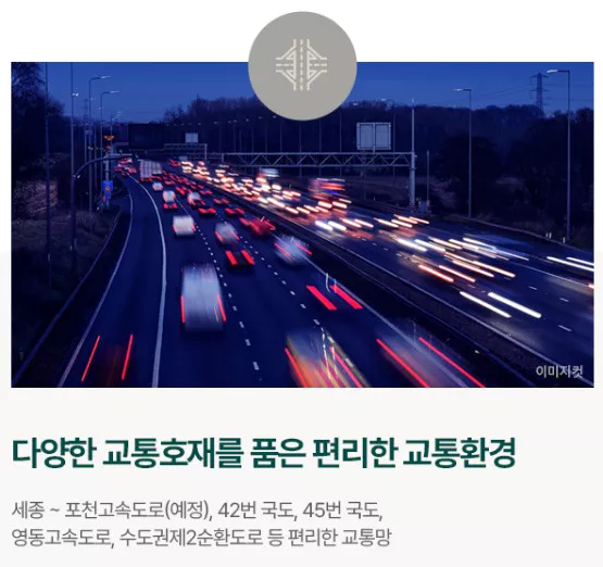์๋๊ณ ์๋๋ก, ์๋๊ถ ์ 2์ํ๊ณ ์๋๋ก๋ฅผ ์ฝ๊ฒ ์ด์ฉํ ์ ์์ผ๋ฉฐ, ์ธ์ข ~ํฌ์ฒ๊ณ ์๋๋ก๋ ๊ฐํต์ ์๋๊ณ ์์ด ๊ตํต ํธ์์ฑ์ด ๋งค์ฐ ์ฐ์ํฉ๋๋ค. ๋จ์ง๋ 45๋ฒ ๊ตญ๋์ ๊ตญ์ง๋ 57ํธ์ ๊ณผ ์ฐ๊ฒฐ๋์ด ์์ด ์ฃผ์ ์ฐ์ ๋จ์ง๋ก์ ์ ๊ทผ์ฑ์ด ๋ฐ์ด๋ฉ๋๋ค.