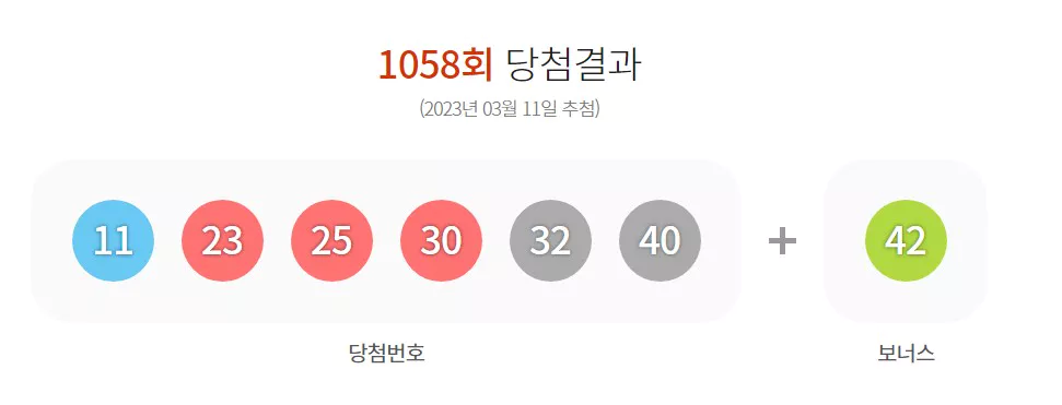 1058 ๋กœ๋˜๋ณต๊ถŒ ๋‹น์ฒจ๋ฒˆํ˜ธ ์ถ”์ฒจ๊ฒฐ๊ณผ 1๋“ฑ ๋‹น์ฒจ๋ฒˆํ˜ธ๋Š” '11, 23, 25, 30, 32, 40'๋ฒˆ์ด ๋‚˜์™”์Šต๋‹ˆ๋‹ค. 2๋“ฑ ๋ณด๋„ˆ์Šค ๋ฒˆํ˜ธ๋Š” ‘42’ ๋ฒˆ์ด๋„ค์š”.