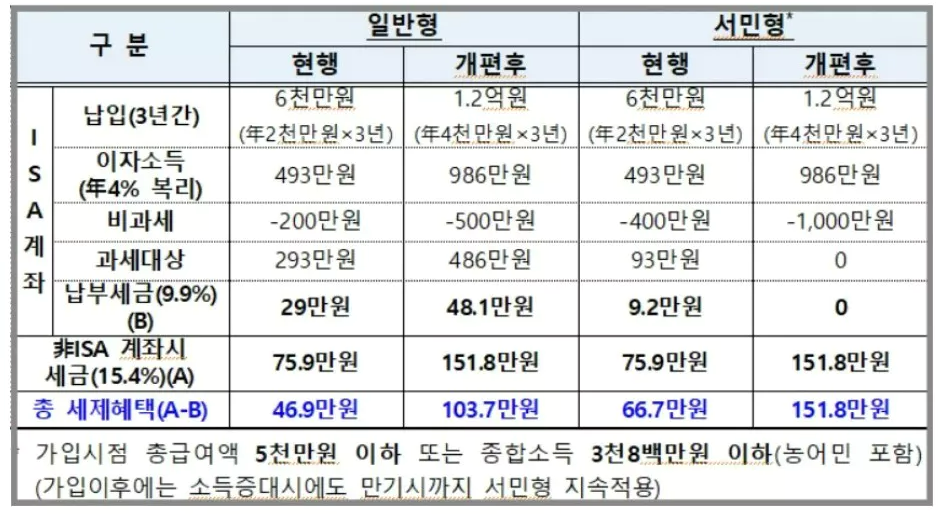 ISA ๊ณ์ข๋ ์๋ฌด๊ฐ์ ๊ธฐ๊ฐ 3๋ ๋ง ์ ์งํ๋ฉด ์ดํ ๋ง๊ธฐ ์ ์์ค๊ณผ ์ด์ต์ ๋ฐ์ ธ๋ณธ ํ ์์ด์ต์ ๊ฒฝ์ฐ ํ์ฌ 200๋ง ์(์๋ฏผ·๋์ด๋ฏผํ 400๋ง ์)๊น์ง ๋น๊ณผ์ธ ํํ์ ์ฃผ๊ณ , ๊ณผ์ธ ํ๋ ์ด๊ณผ๋ถ์ 9.9% ์ ์จ๋ก ๊ณผ์ธํ๋ ๋ํ์ ์ธ ์ ์ธ์ํ์ ๋๋ค.